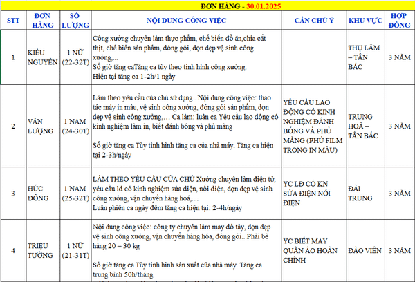 TỔNG HỢP ĐƠN HÀNG T4 THÁNG 1 - 2026Tuyển dụng với rất nhiều cơ hội lớn dành cho các bạn lao động đang tìm kiếm cơ hội việc làm tại...